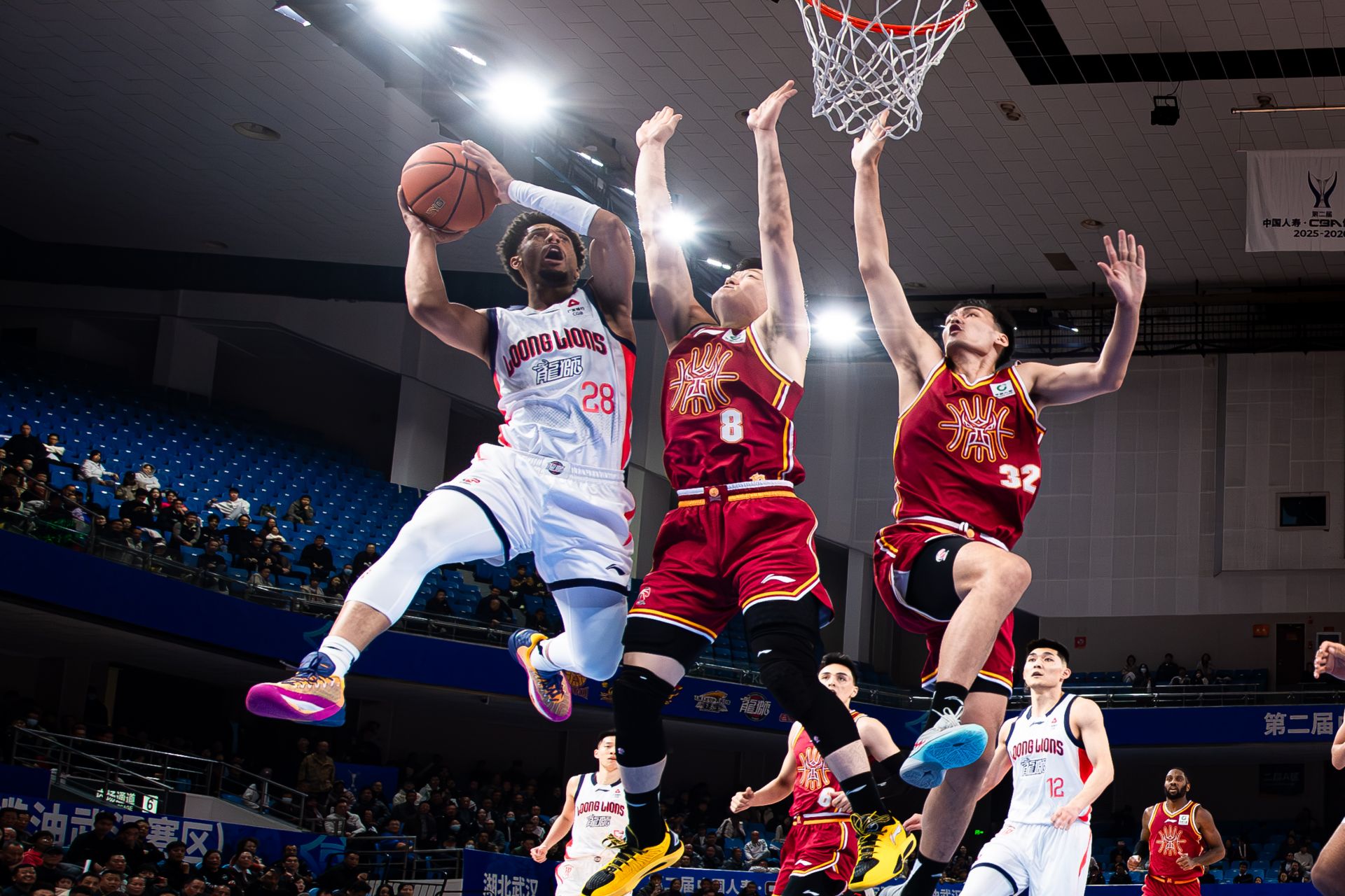 12月3日,廣州朗肽海本隊(duì)球員威金頓(左)在比賽中上籃。
