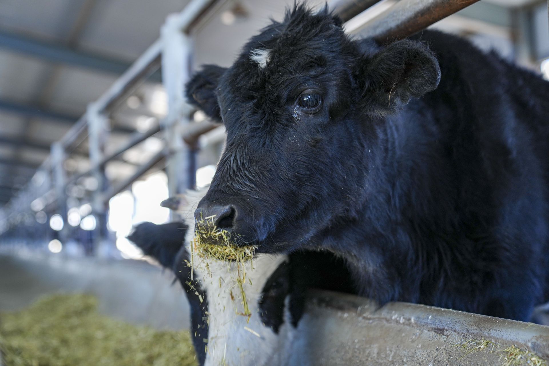 12月3日,克隆樟木牛母犢在西藏動(dòng)物疫控中心(區(qū)畜牧總站)曲水實(shí)驗(yàn)站牛場(chǎng)吃草料。