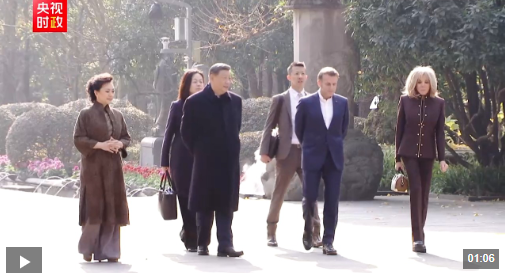 初冬的都江堰,蒼山掩翠。馬克龍夫婦抵達時,受到習近平和彭麗媛熱情迎接。兩國元首夫婦沿堰功道邊走邊談。習近平介紹都江堰歷史和意義,指出都江堰水利工程是全世界迄今唯一仍在使用的古代水利工程,也是人類與自然和諧共生最早的成功實踐之一,修建過程充分反映了中華民族自強不息、不畏艱難、勇于開拓的精神。兩國元首夫婦落座懷古亭,臨水品茗,縱論天下。