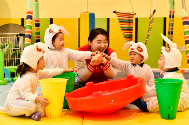 2025年2月20日,在山東省日照市東港區(qū)知子樹(shù)托幼園,老師陪伴孩子做游戲。新華社記者 郭緒雷 攝
