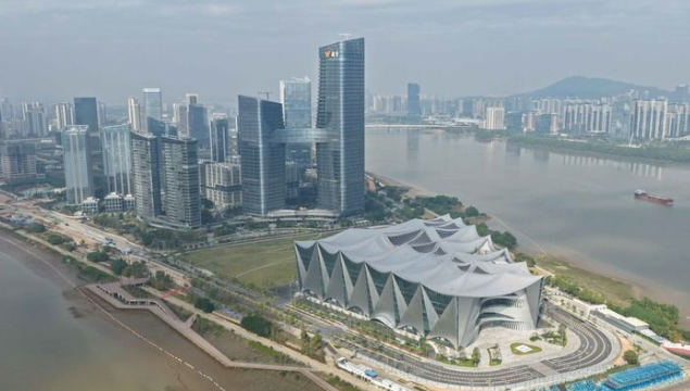 這是2025年12月11日拍攝的位于廣州市南沙區(qū)明珠灣靈山島尖的大灣區(qū)科學(xué)會(huì)堂(無(wú)人機(jī)照片)。新華社記者 鄧華 攝